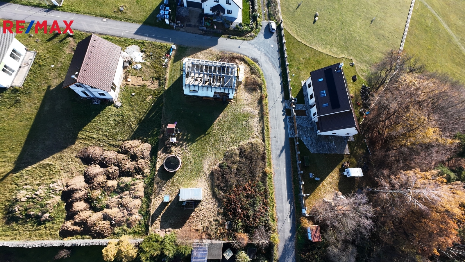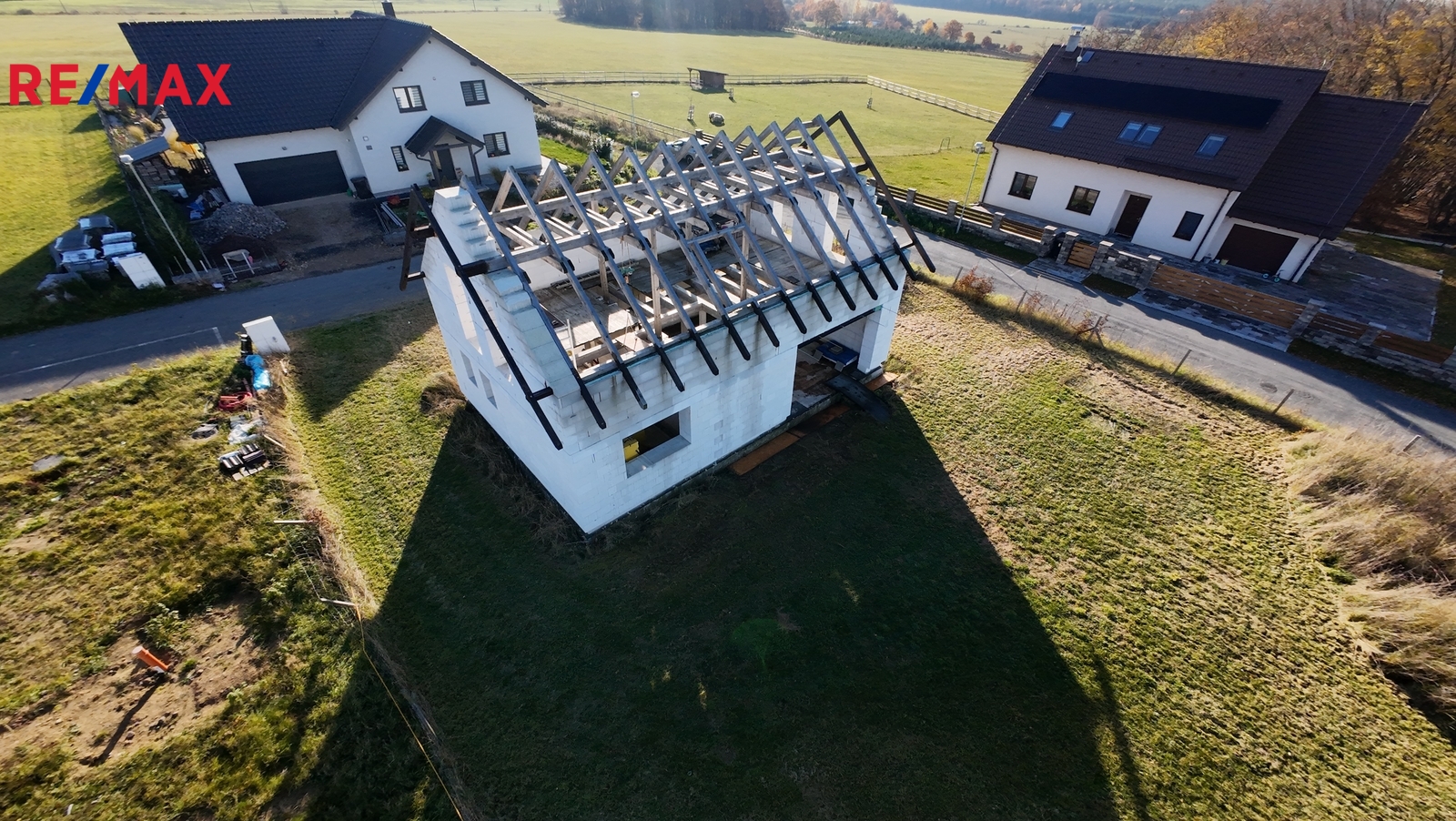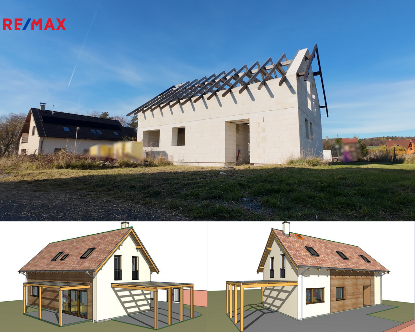 Aktuálně je dokončena hrubá stavba – zdi + krov. Do domu jsou přivedeny přípojky – voda, elektřina, kanalizace a příprava na dešťovou vodu do technické místnosti.
